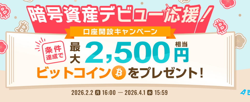 2026年2月02日(月)16:00から2026年4月1日15:59までの期間限定で、口座開設完了 + 合計5,000円以上の暗号資産を購入した場合、2,500円相当のビットコインがプレゼントされます。