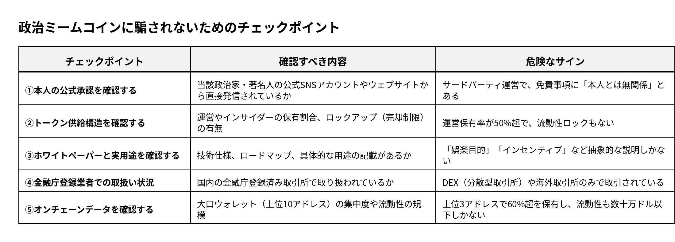 - 1.9 政治ミームコインに騙されないための5つのチェックポイント